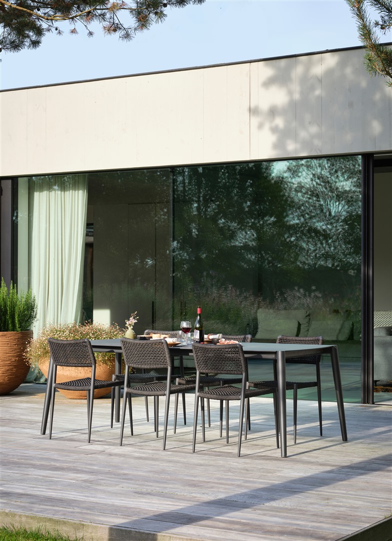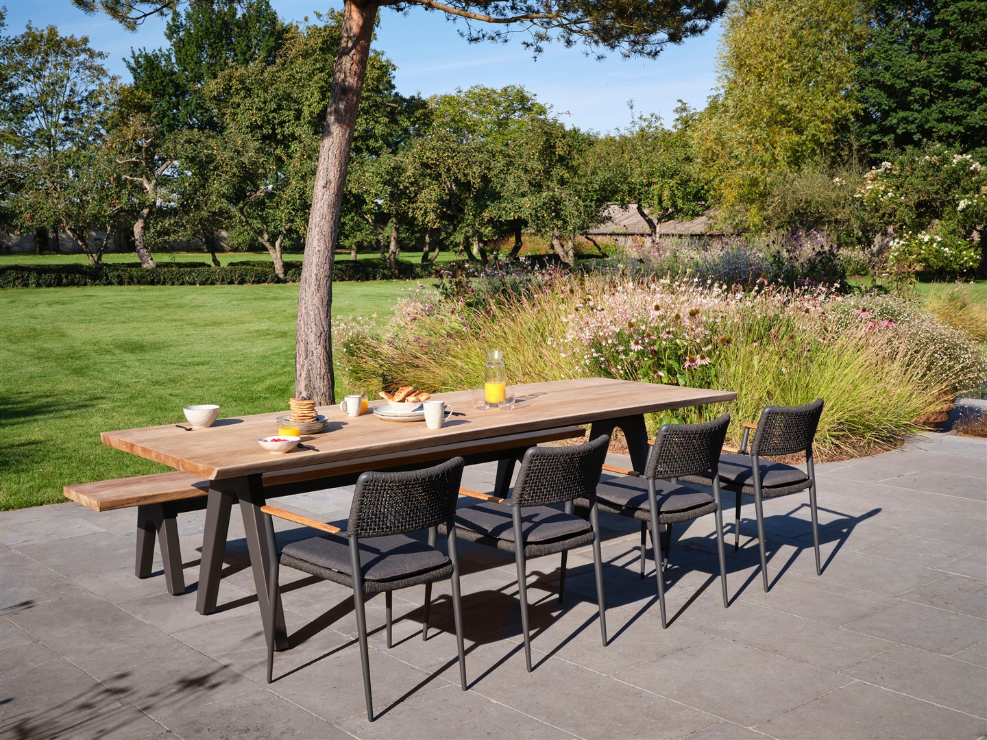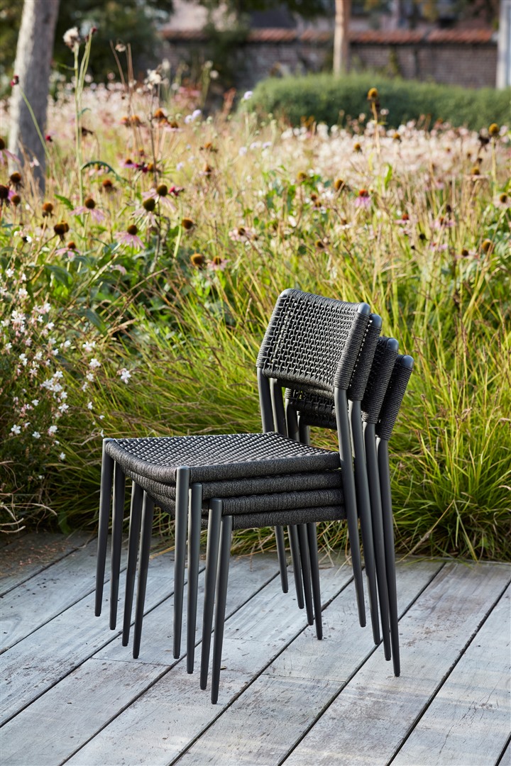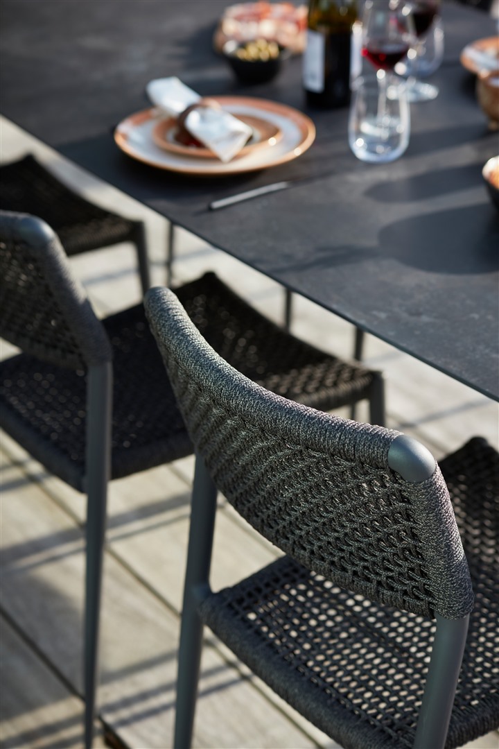 Eén van de grootste troeven van de RAY collectie is ongetwijfeld het luchtige design. De zitting en de rugleuning van deze charmante tuinstoelen zijn voorzien van ambachtelijk geweven, weerbestendige touwen. Deze geven een warme en natuurlijke toets aan de stoel en maken het geheel licht en luchtig. De stoelen zijn verkrijgbaar met of zonder armleuning. Het duurzame aluminium frame van de stoel, in de kleur wit of lava, is gemakkelijk stapelbaar. Het frame buigt iets naar achteren, waardoor je geniet van maximaal zitcomfort. Dankzij de elegante armleuning in teak zijn de armstoelen de perfecte metgezel voor alle teakhouten tafelbladen.