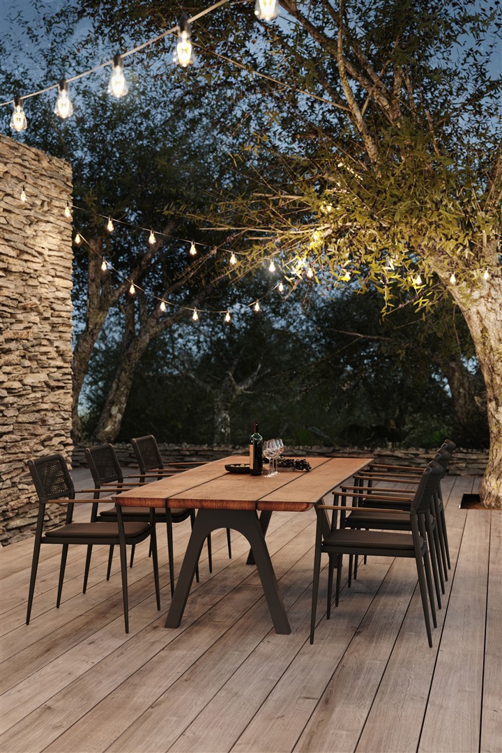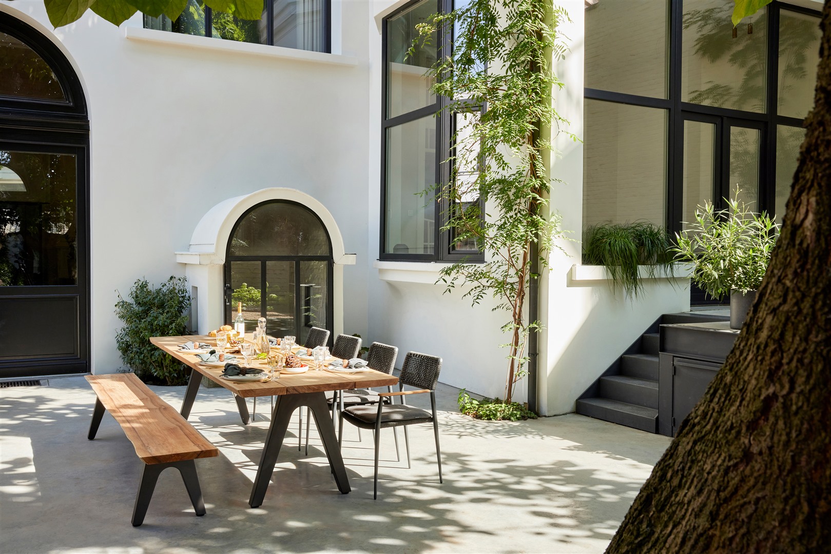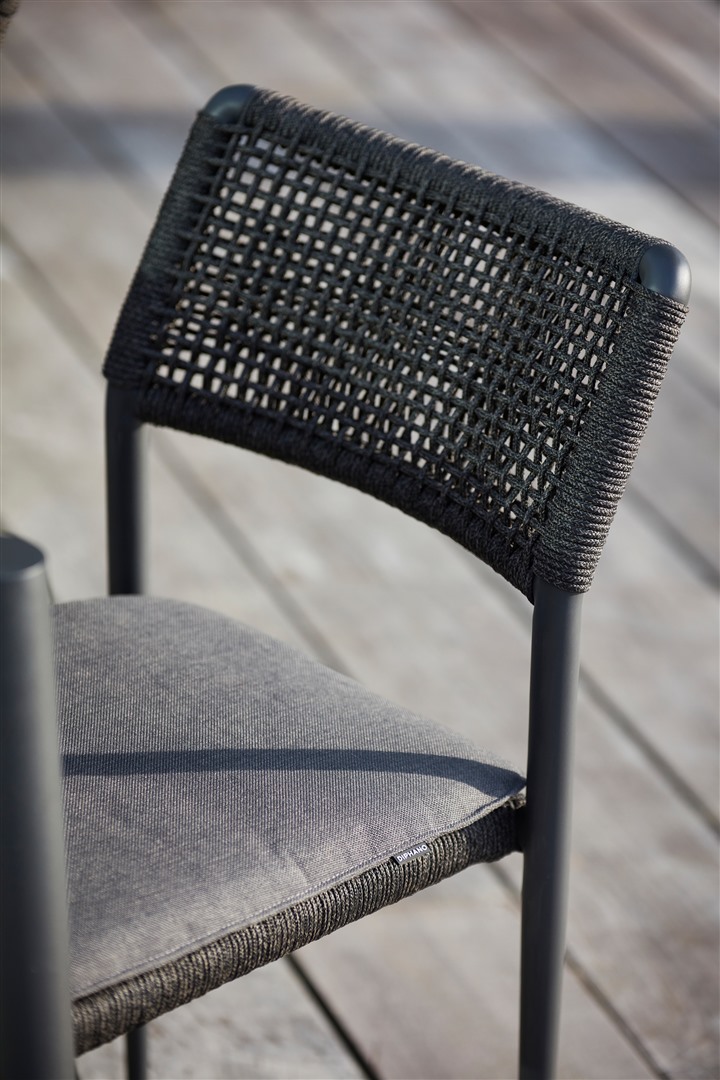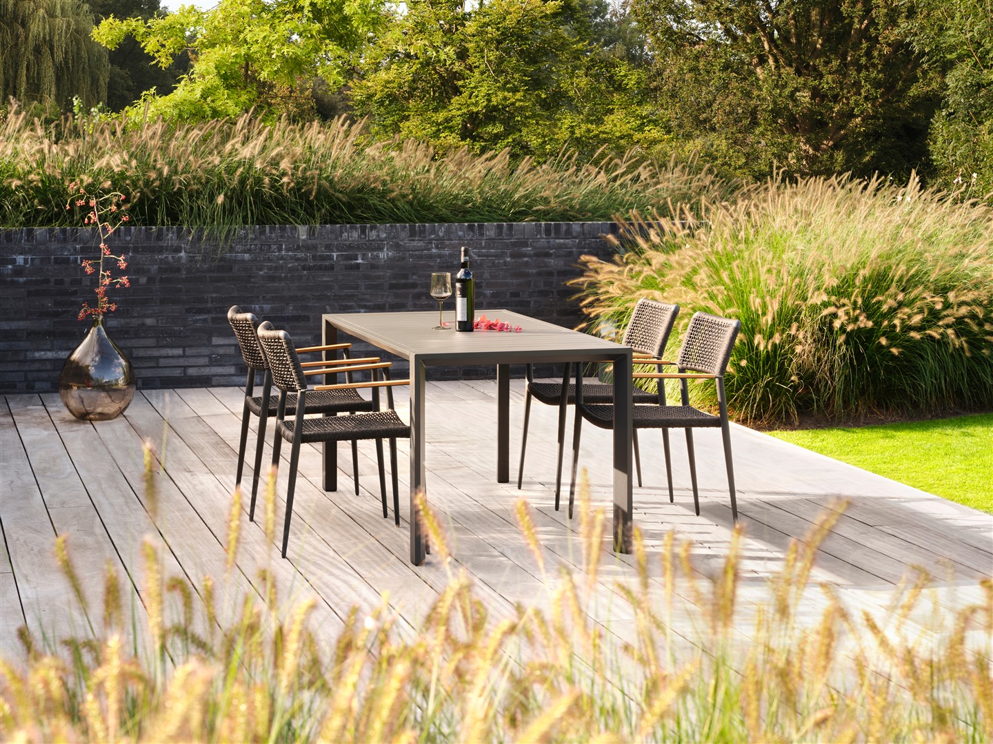 Eén van de grootste troeven van de RAY collectie is ongetwijfeld het luchtige design. De zitting en de rugleuning van deze charmante tuinstoelen zijn voorzien van ambachtelijk geweven, weerbestendige touwen. Deze geven een warme en natuurlijke toets aan de stoel en maken het geheel licht en luchtig. De stoelen zijn verkrijgbaar met of zonder armleuning. Het duurzame aluminium frame van de stoel, in de kleur wit of lava, is gemakkelijk stapelbaar. Het frame buigt iets naar achteren, waardoor je geniet van maximaal zitcomfort. Dankzij de elegante armleuning in teak zijn de armstoelen de perfecte metgezel voor alle teakhouten tafelbladen.