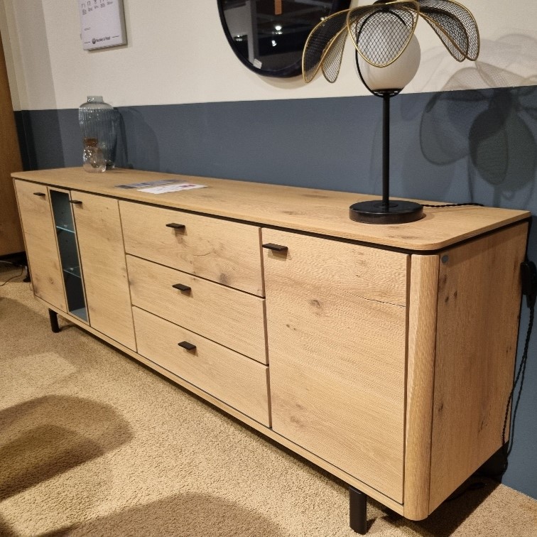 Zoek je een groot dressoir met voldoende bergruimte? Hou je van meubels met een moderne uitstraling en een natuurlijk karakter? Dan is dit dressoir uit de Livada collectie een aanrader. Deze dressoir is 240 cm breed, heeft stoere zwart metalen details en is gemaakt van wild eiken fineer. Voor de afwerking is gekozen voor de kleur "natural". Dankzij de 3 laden, 3 deuren en 3 niches is er voldoende bergruimte. Fijn detail : de niches zijn voorzien van warm ledlicht.